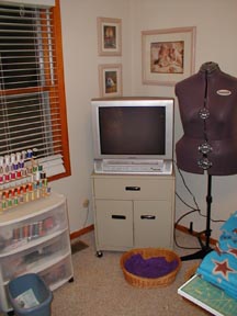 The metal cart holds embroidery supplies. Hilda (the dummy) is next to the tv and cart. I got the tv from my mom for my birthday last year. Thanks mom! I like being able to watch sewing dvds in the same room where my machines are. 2 cat baskets on the floor, but they both like to sleep in the one that's visible here, usually one on top of the other.