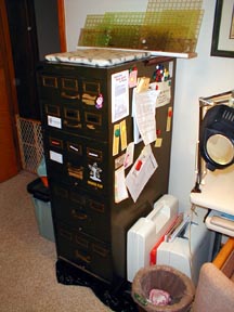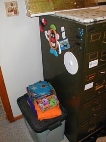 The other side of the card catalog. Yep, that's a Mr Potato Head magnet set! The bin on the floor is for recycle stuff, and those are fleece scraps on top of it that will eventually make their way to the person who's going to make headbands for the Fleece Project (not me). The top of the cabinet holds a small ironing pad and my ruler rack that the Russian made for me.