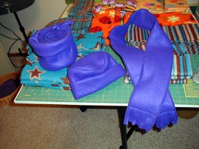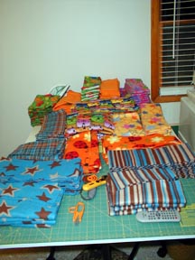 This is what 50 scarf and hat sets look like before they're stitched, hanging out on my cutting table. 'Nuff said.
