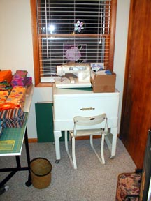 The Ironrite. This thing is really handy, and does a beautiful job pressing all sorts of things. That's a genuine "Health Chair", too! Thanks to Carl's Mom's friend, Rada for the Ironrite, she found it in her house when she moved in. Works great! The machine on top is the Snoopy embroidery machine, which I sold on Ebay in January '07. The box next to it contains assorted other junk I sold. Now that the stuff is sold, I have an ironing board we made that just fits on top of the ironer, which seems appropriate somehow. :) Also barely visible in this photo, on the lower right corner, is the case I use for carting my machines to class. The closet is also on the right, look for photos of that later, I'm in the process of cleaning it out. This photo is of the east wall, sorry for the flash glare.