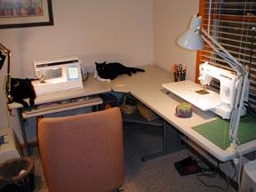 These are my 2 main machines. The serger usually sits in the corner. I think Kenny is on the left, and Vic is on the right (cats). The machine on the left is the D1 and the Juki is on the table to the right. That little round thing in front of the Juki is my latest prized possession...it's a wool pincushion. Really cool, the lanolin in the wool keeps the pins from rusting. Plus, it holds a LOT more pins than the little tomatoes. I have one of those rotating mats next to the Juki. The original idea was that this mat would be all that was on that arm of the table, but when I'm working with Thangles I find that I really need two machines set up (grumble grumble): one for 1/4" piecing, and one for running the Thangles through. The corner table has a shelf underneath it where I keep 2 baskets, one for common notions, and one for, well, I don't know what, exactly. My buttons are in that one, and some other stuff.