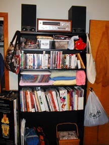 Of all the things in the studio, this one has changed the most since the photos were taken. The top shelf holds a stereo that's older than I am! The 2nd shelf holds various works in progress and a little bag of Play-doh I break out when I'm between projects. The 3rd shelf holds movies that I watch on a regular basis (organized in alphabetical order, of course!). 4th shelf has a box of fat quarters and some hat fabric that's since been cut and delivered to the rightful owner (hi mom!). 5th shelf are frequently used sewing books, magazines and machine manuals. The bottom shelf holds the Janome in-between classes, my "to-go" notions bag, and a pretty sewing basket I got at auction that came with enough blocks for 2 twin size quilts (for $10). The bags hanging off the sides of the shelves each hold a future project. They've since been relegated to the bottom shelf. The one on the left is going to be the Music Quilt, and the one on the right is the black quilt. Finished hats and scarves hang on the door handle until I remember to turn them in.