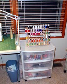 Thread stand and rolly-cart. I only use Guttermann thread for the most part, these are just the colors I used on the Fleece Project. The top drawer of the cart contains quilting patterns and assorted accessories. The middle drawer has a watercolor quilt project and another art project I need to get rid of (anybody into wreath making?). The bottom drawer is reserved for crayons, colored pencils, construction paper and coloring books. When I'm between projects I'll usually do a paper art project just to get the creative side going again. I've discovered that if I occupy the technical side of my brain doing something like coloring between the lines, the creative side can take over and I'll usually dream up a new project. Someday I want to find a thread rack for the back of the door into this room so I can hang my serger and embroidery threads, too. As it is, the embroidery threads are in the little plastic bin next to the cart. Like a lot of people, I used a hot wheels storage box for embroidery thread storage. Hey, it works!